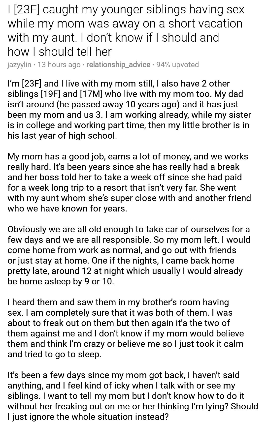 ![relationships.bsky.social on X: I [23F] caught my younger siblings having sex while my mom was away on a short vacation with my aunt. I don't know if I should and how I](https://i0.wp.com/pbs.twimg.com/media/DpuKvhrW4AAXnVc.jpg:large?ssl=1)